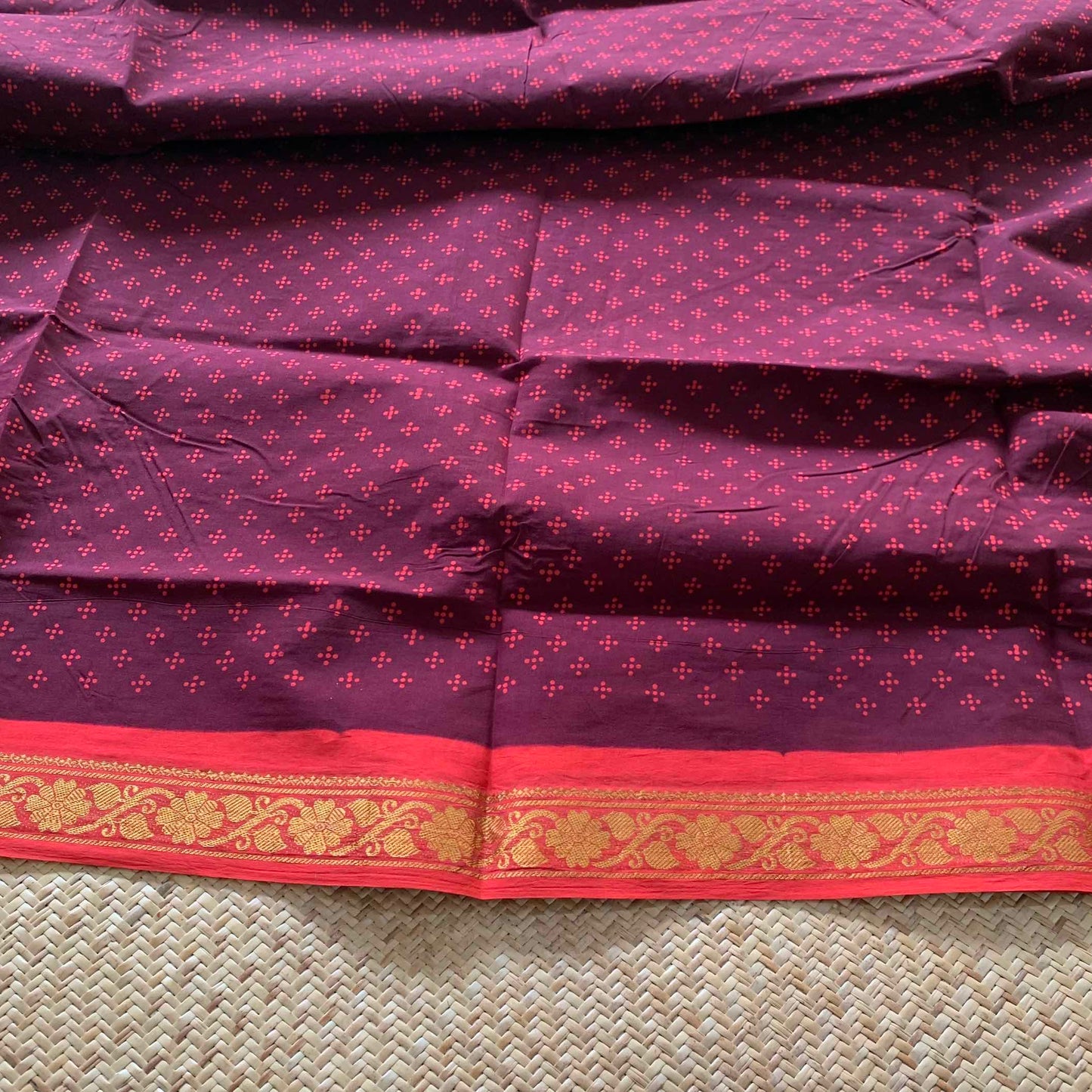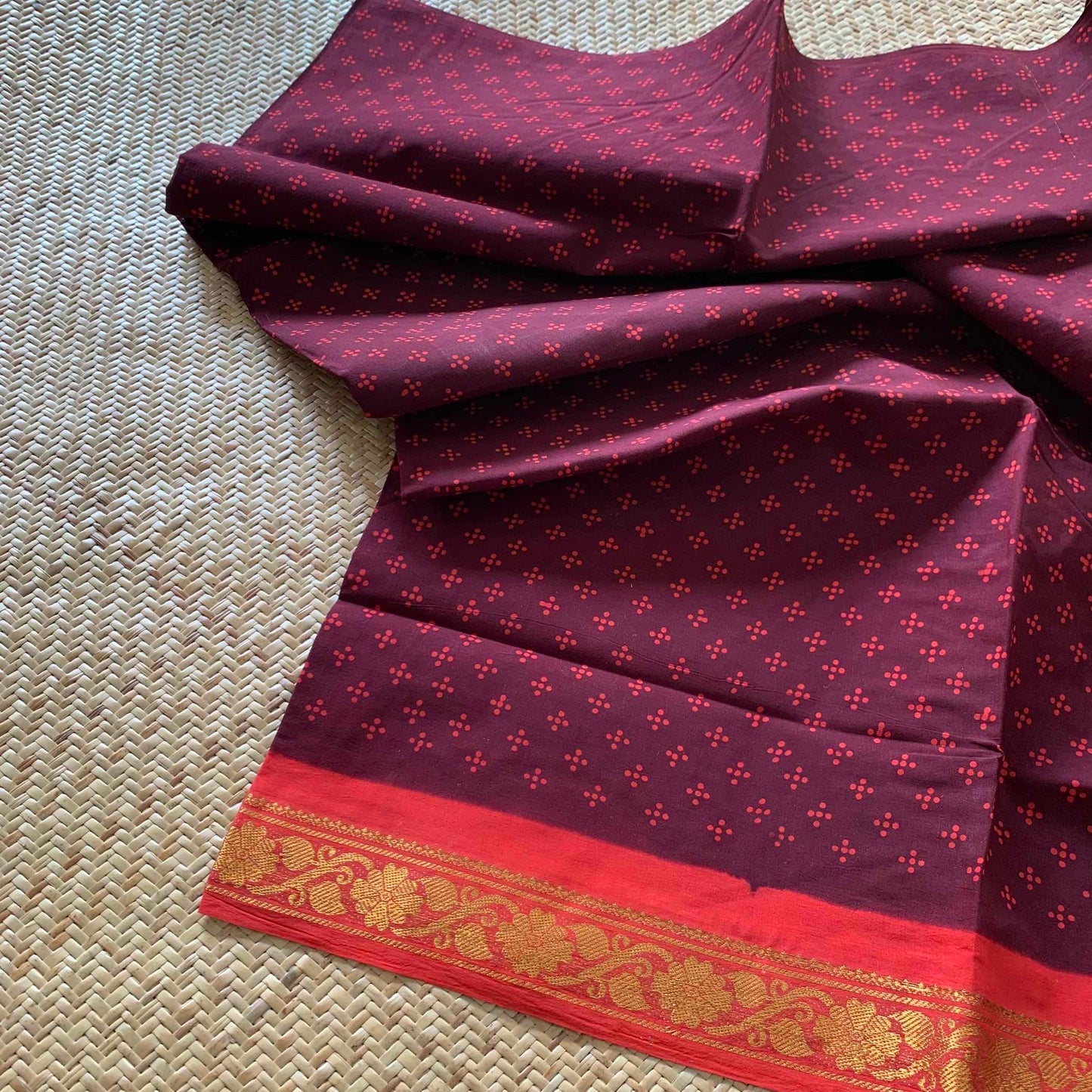 Beetle nut Brown With Red Wax Print, Half Fine Zari Premium Sungudi Cotton Sarees
