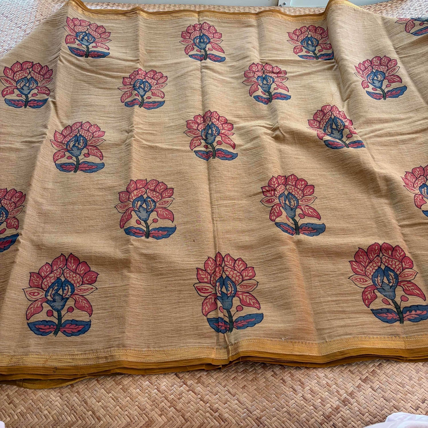 Biscuit Kalamkari Hand Painted on Chettinad Cotton saree