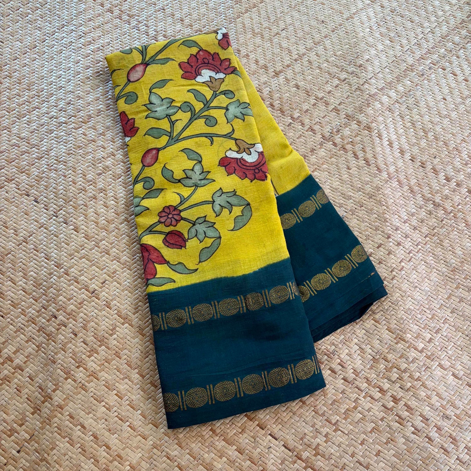 Botanical, Kalamkari Hand Painted on a Madurai Sungudi Cotton saree.