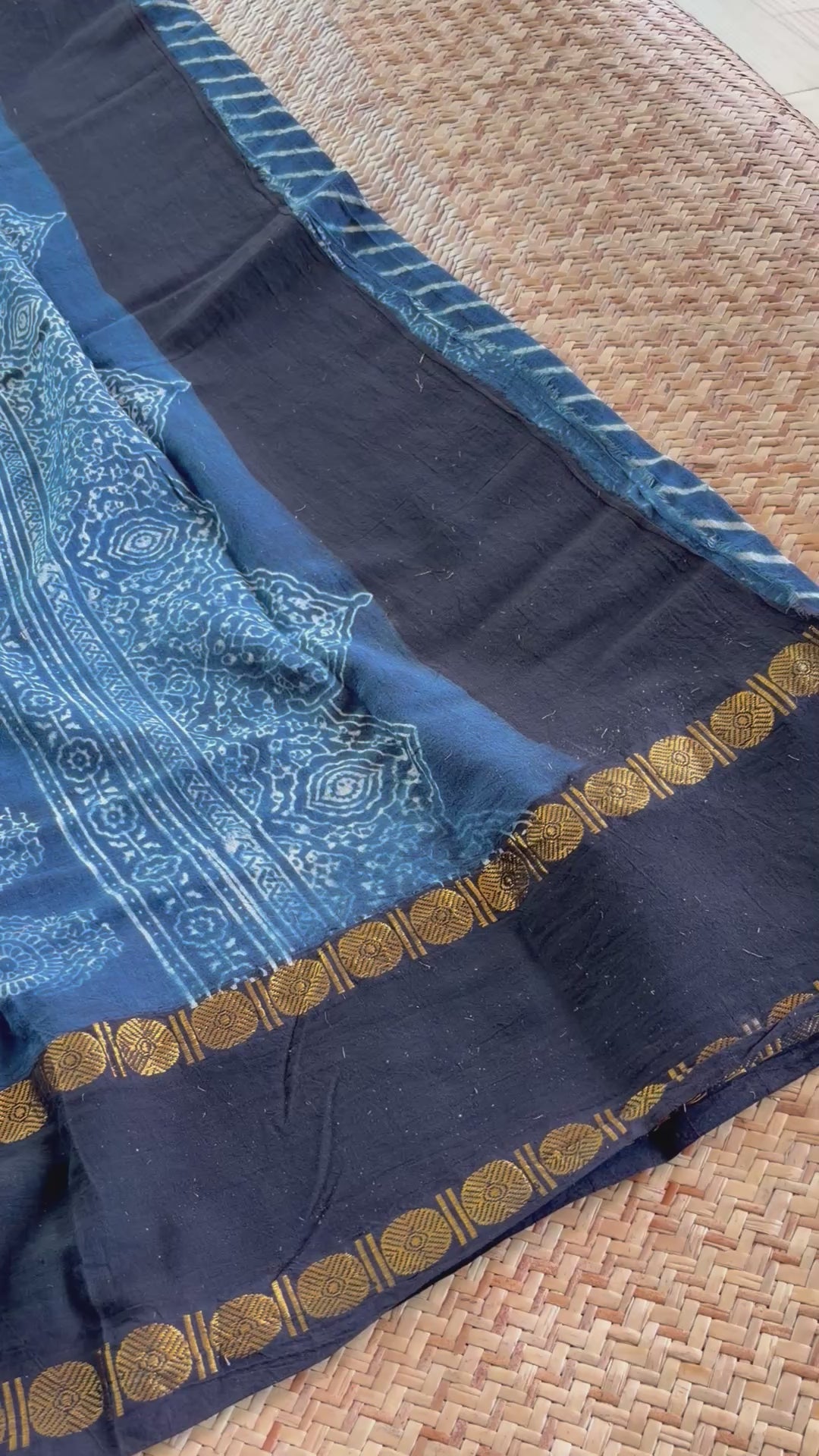 Diagonal Indigo, Ajrak Hand Block Printed On Madurai Cotton Saree With Zari