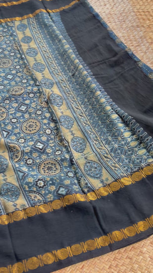 Diamond Indigo, Ajrak Hand Block Printed On Madurai Cotton Saree With Zari
