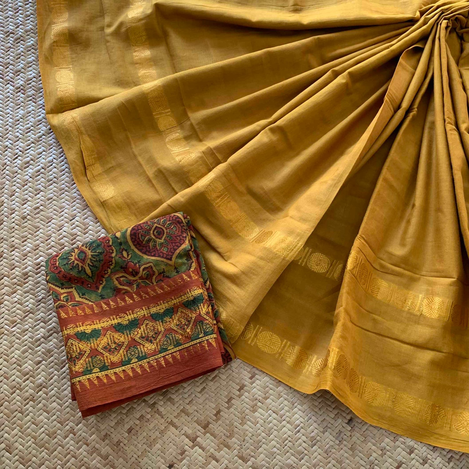 Golden Mustard Saree With Ajrak Blouse , Zari Rudraksham Rettai Pettu Border , Clamp dyed (Kattu sayam).