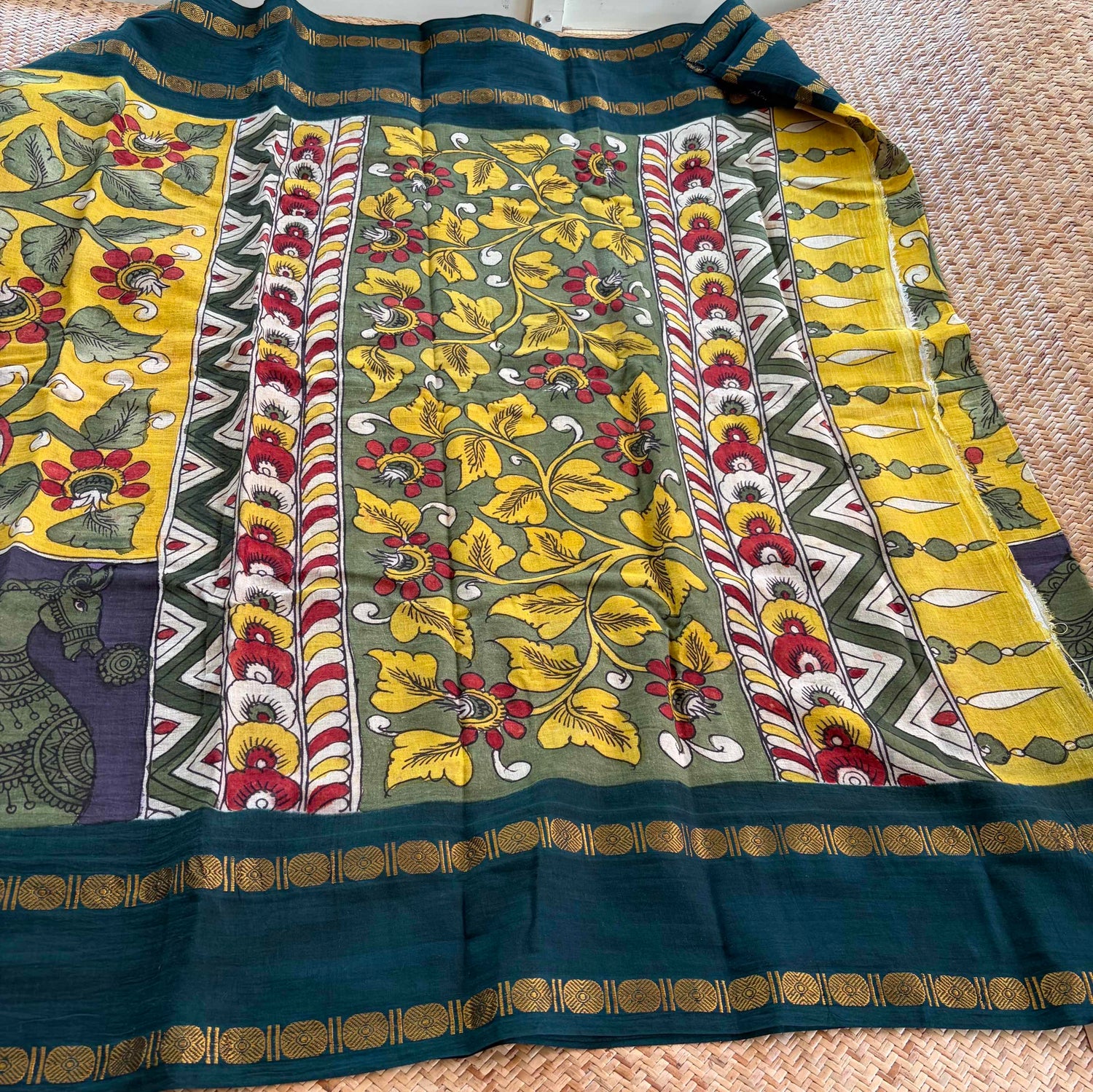 Villvam Kalamkari Hand Painted on a Madurai cotton saree.