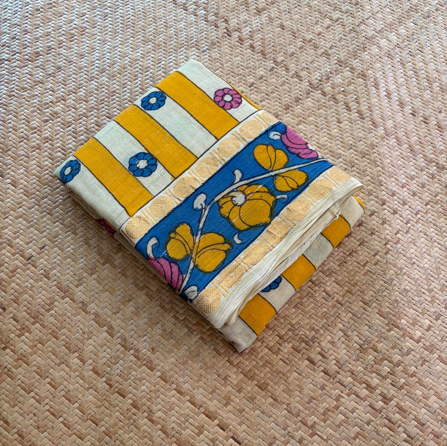 Yellow Strips Kalamkari Hand Painted on Cotton Sungudi Saree With Blouse