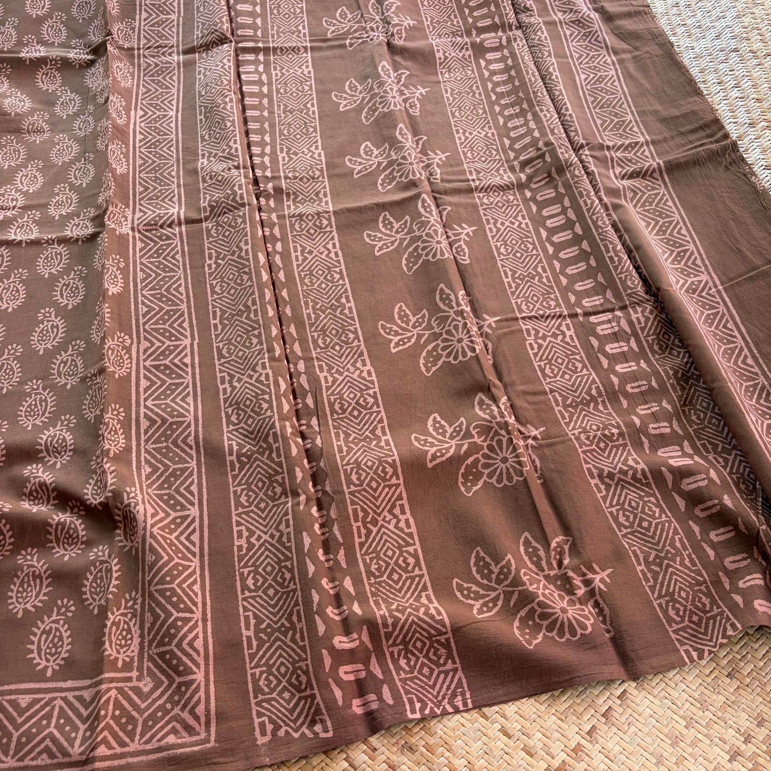 Mul Mul Cotton saree, Hand Block Printed, Brown