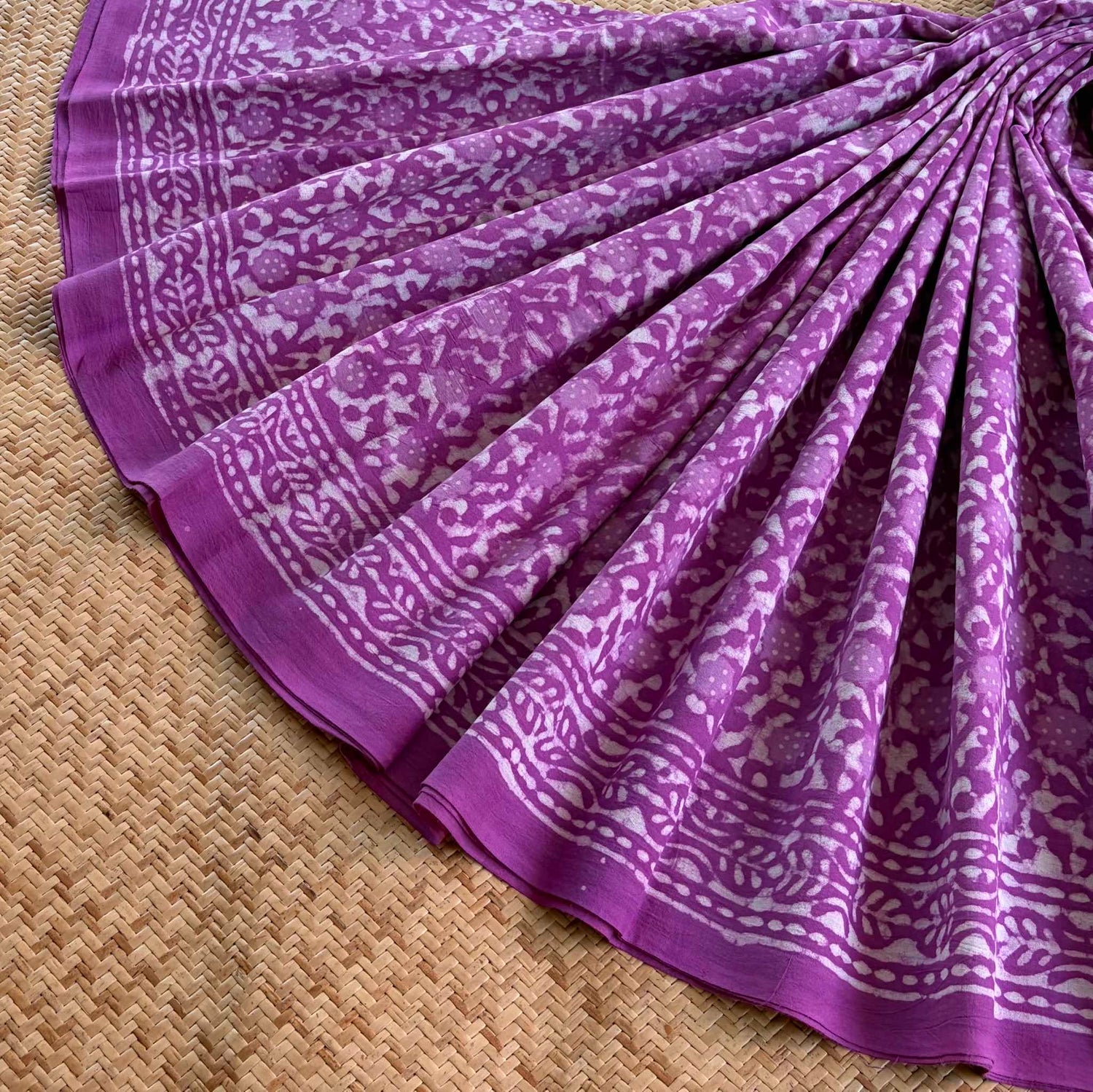 Mul Mul Cotton saree, Hand Block Printed, Purple