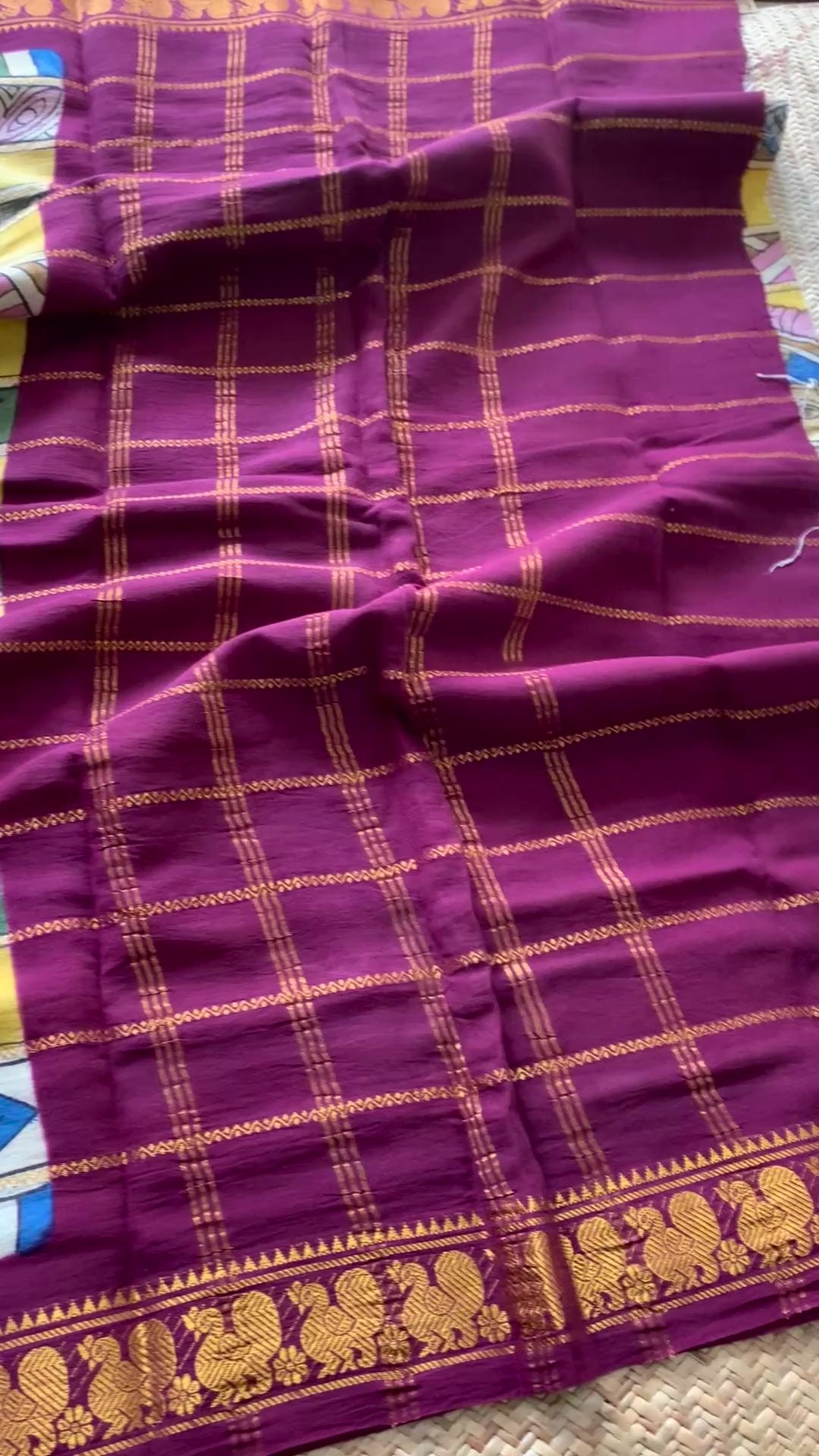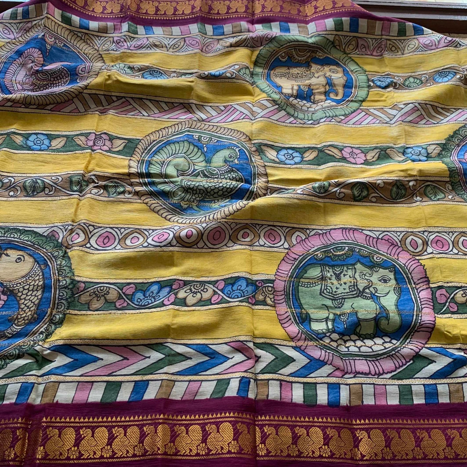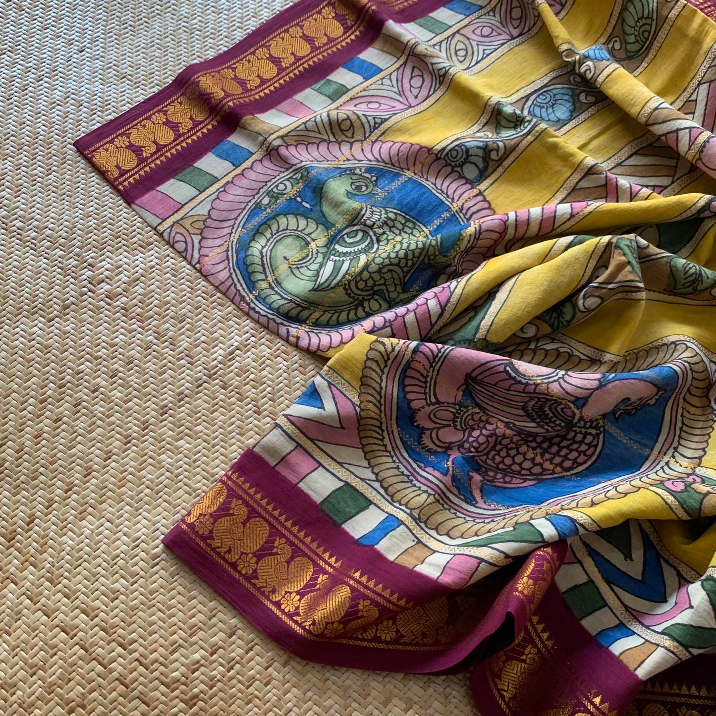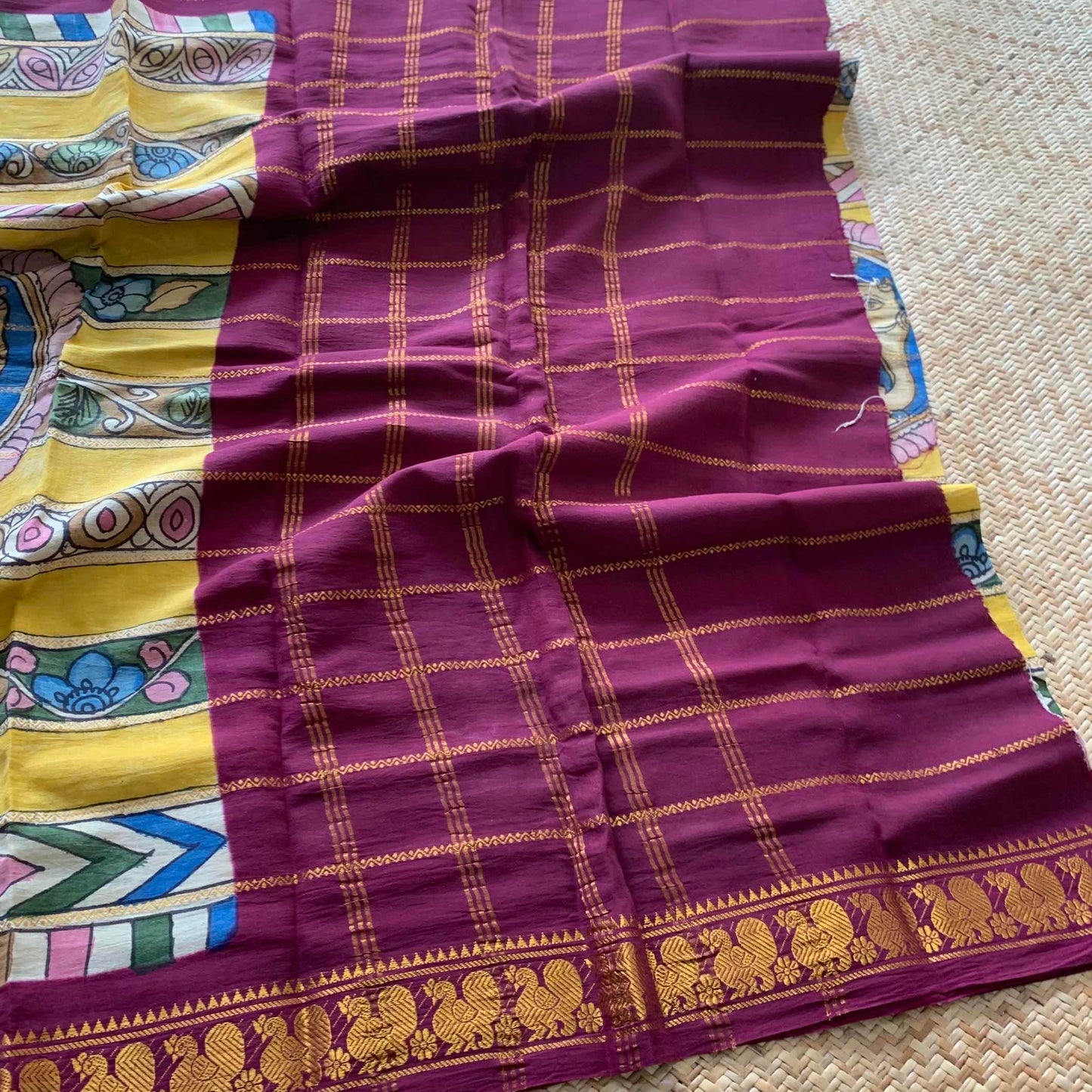 Villvam Kalamkari Hand Painted on a Madurai cotton saree.