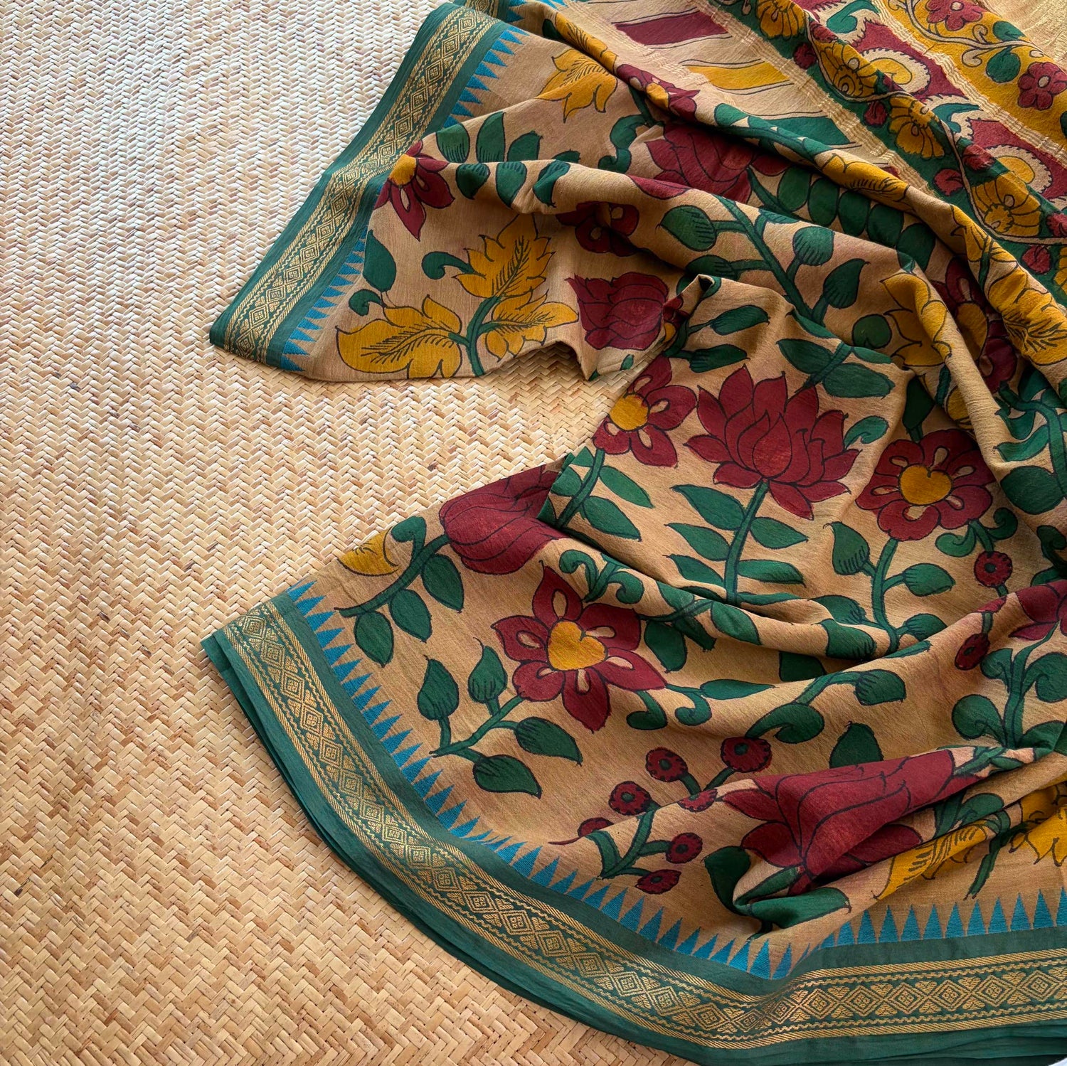 Villvam Kalamkari Hand Painted on a Madurai cotton saree.