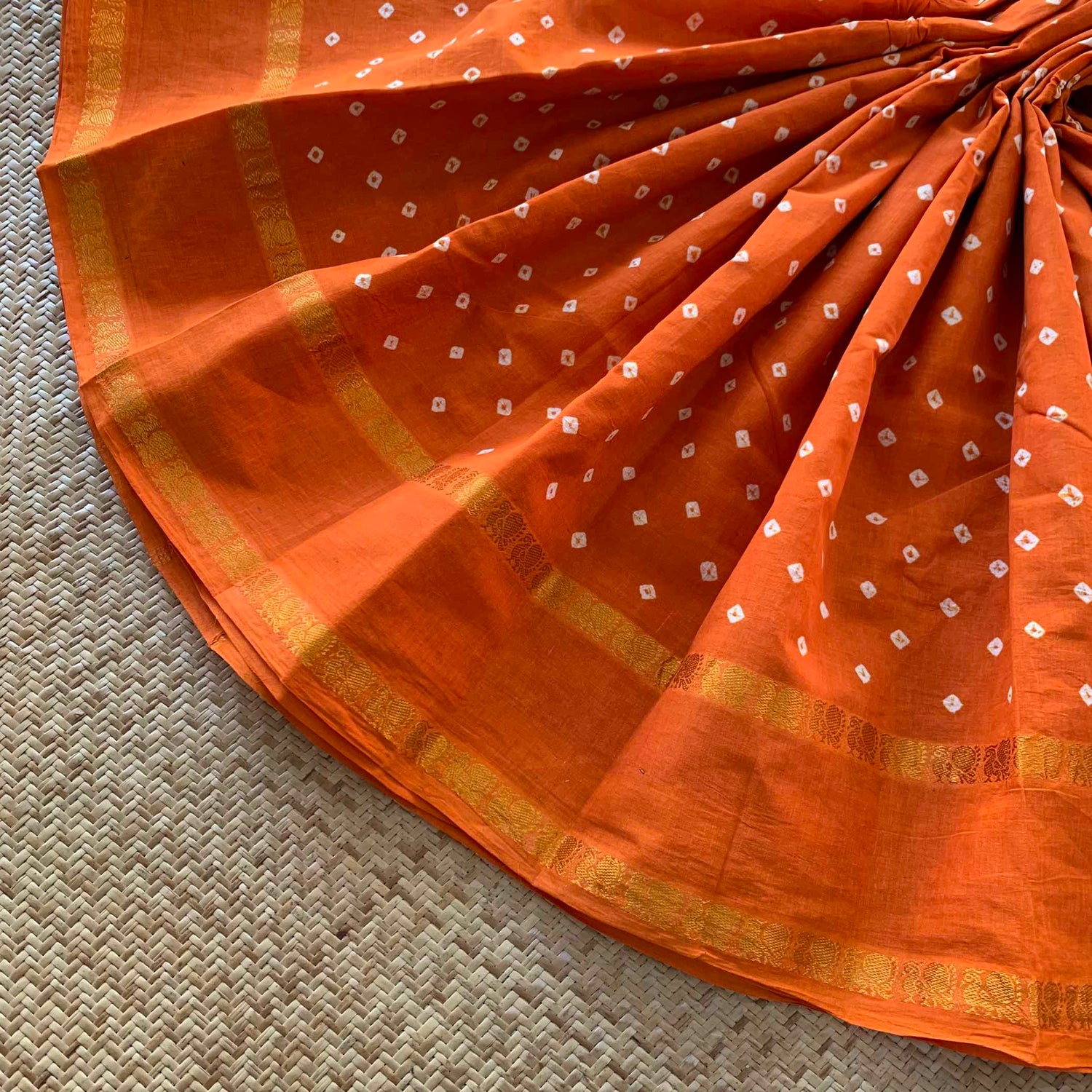 Orange Saree, Hand knotted Sungudi On a Annam Border Cotton saree, Kaikattu Sungudi