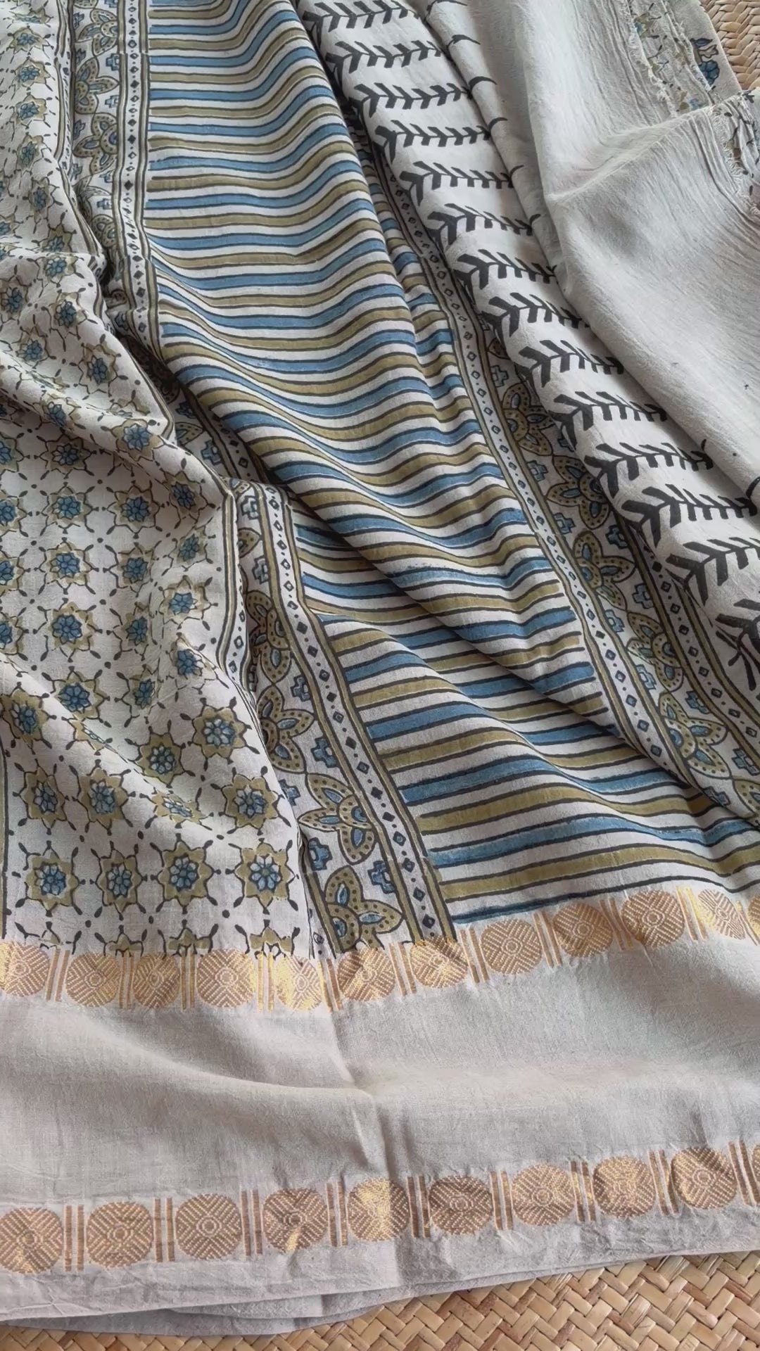 The white sarees are woven in Madurai and borders are clamp dyed by fine Kattuchayam artists and taken to Gujarat for Hand block printing and Natural dyeing.