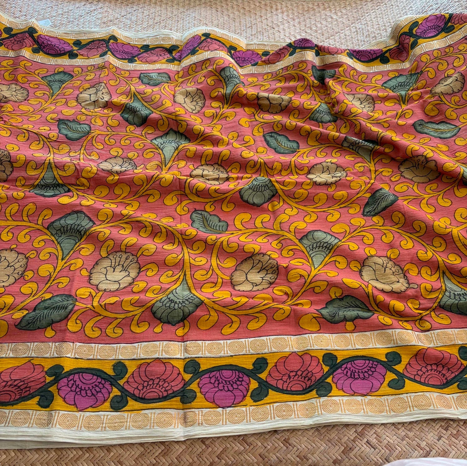 Villvam Kalamkari Hand Painted on a Madurai cotton saree.
